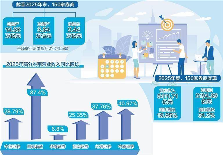 从全行业来看,发展动能持续增强。中国证券业协会最新数据显示,150家券商2025年度实现营业收入5411.71亿元,同比增长19.95%;实现净利润2194.39亿元,同比增长31.2%。截至2025年末,150家券商总资产达14.83万亿元,净资产为3.34万亿元,净资本为2.44万亿元,各项核心资本指标均保持稳健。